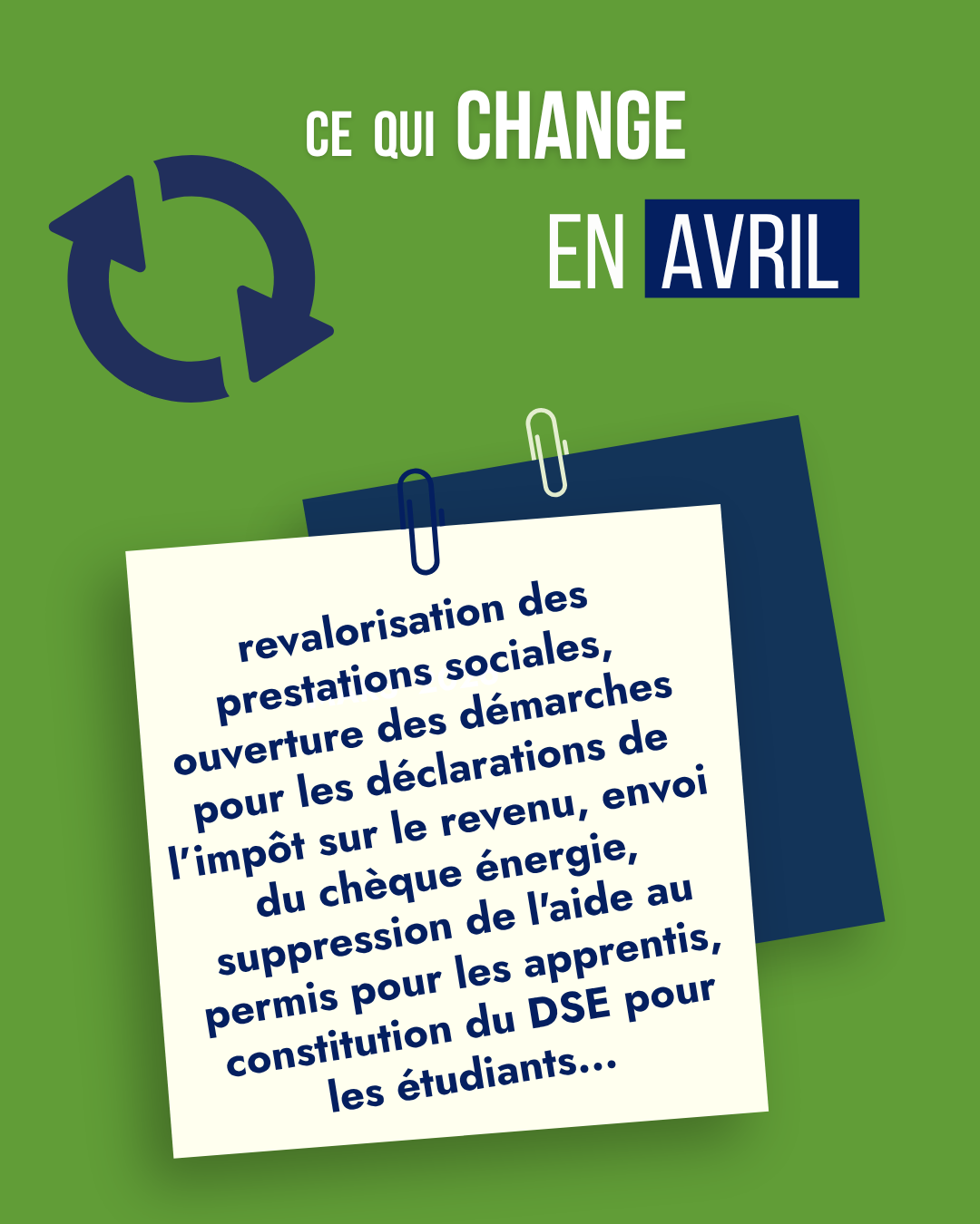 À partir du 1er avril plusieurs mesures entrent en vigueur : revalorisation des prestations sociales, ouverture des démarches pour les déclarations de l’impôt sur le revenu, envoi du chèque énergie aux foyers bénéficiaires, suppression de l'aide au permis pour les apprentis, constitution du DSE pour les étudiants, arrivée d’un traitement préventif injectable contre le VIH...