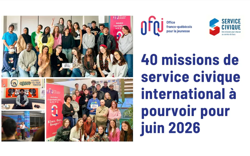 Agréé par l’Agence du Service civique, l’OFQJ permet aux jeunes français de 18 à 25 ans (élargi à 30 ans pour les personnes en situation de handicap) d’effectuer une mission de Service civique dans des structures francophones sur le continent américain. Chaque année, trois promotions de volontaires partent au Québec, au Canada ou dans d’autres pays et s’engagent dans des missions citoyennes et de promotion de la langue française.