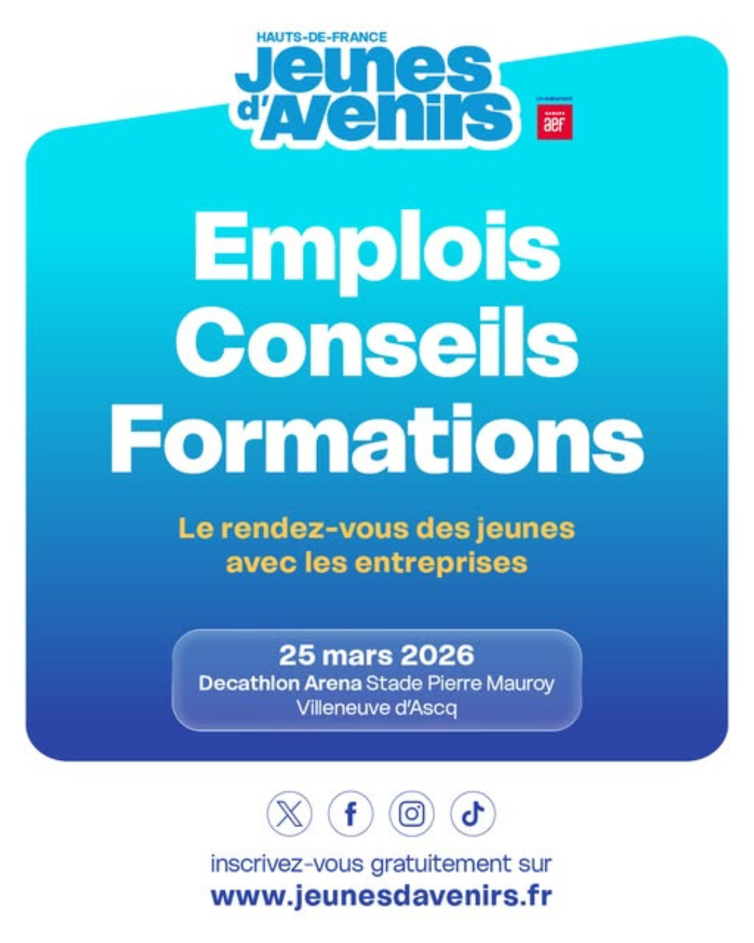 Vous avez entre 16 et 30 ans ? Vous êtes à la recherche d’un stage, d'une alternance ou d’un emploi ? Le Salon Jeunes d'Avenirs revient à Villeneuve d'Ascq le mercredi 25 mars prochain à la Décathlon Arena - Stade Pierre Mauroy.