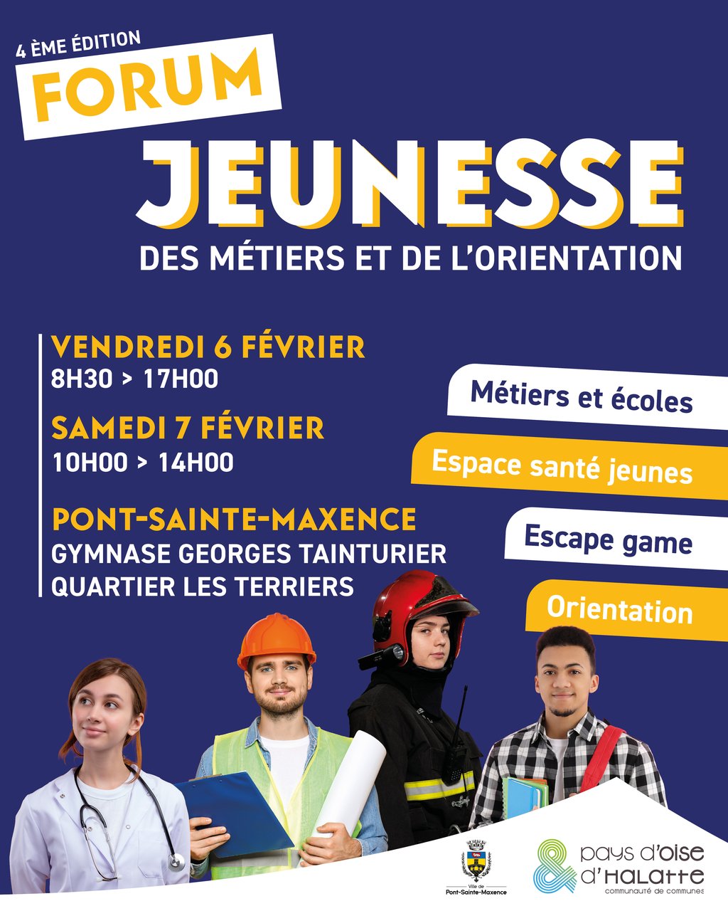 Ne manquez pas le Forum Jeunesse des Métiers et de l'Orientation qui se tiendra au Gymnase Georges Tainturier de Pont-Sainte-Maxence les 6 et 7 février 2026 !