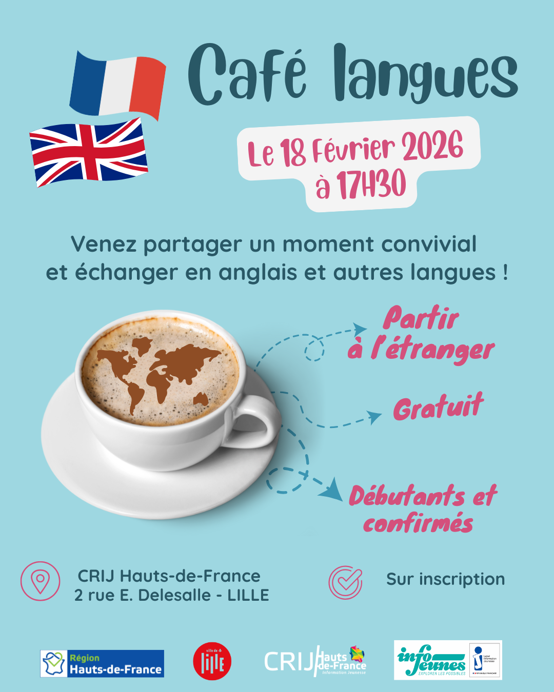 Dans le cadre de sa nouvelle programmation, le CRIJ vous invite à venir échanger en plusieurs langues lors de Cafés Langues organisés chaque mois, dans ses locaux. Nous vous donnons rendez-vous pour le tout 1er Café Langues le mercredi 18 février 2026, dès 17h30 !